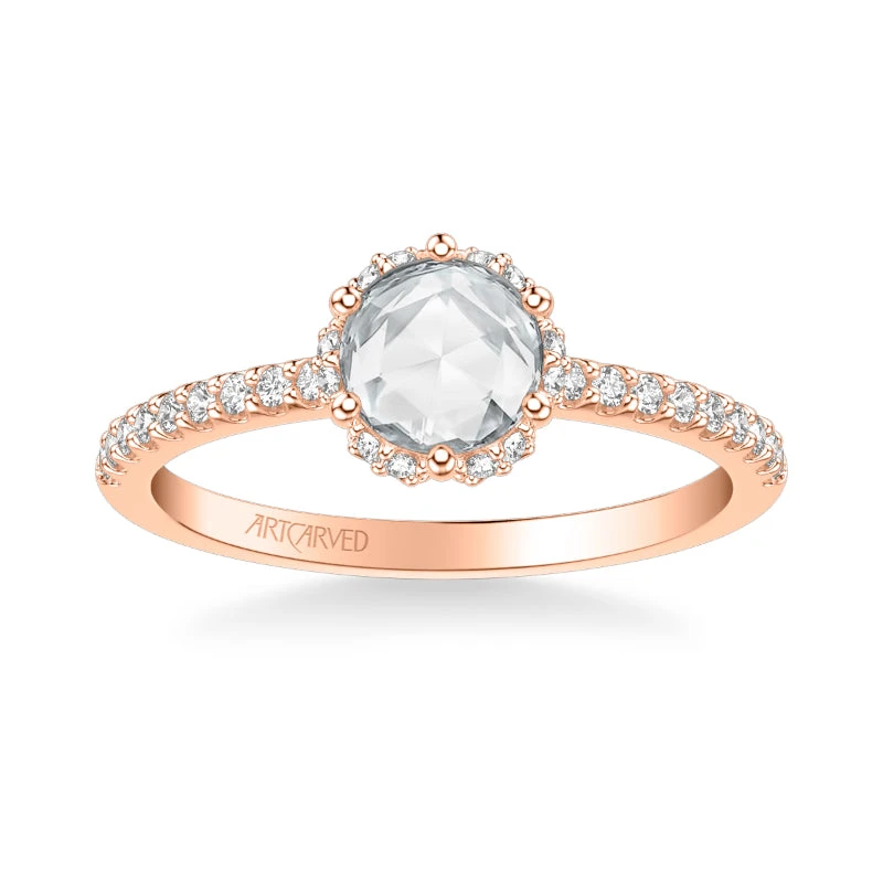SKU: Y2ZYA 82316234591031 Category: Engagement Rings Tags: Category_l1: Engagement Rings>Halo, Category_l2: Halo, Category_tree: Engagement Rings>Halo, Center_stone_shape: Round, Collection: Rosecut, Designer: ArtCarved Bridal, Diamond_setting: Prong, Gender: Women, Metal_color: Rose, Metal_type: 18k Gold, Number_of_diamonds: 31