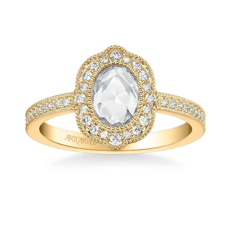 SKU: Y2ZYA 82312436452151 Category: Engagement Rings Tags: Category_l1: Engagement Rings>Halo, Category_l2: Halo, Category_tree: Engagement Rings>Halo, Center_stone_shape: Oval, Collection: Rosecut, Designer: ArtCarved Bridal, Diamond_setting: Bezel, Gender: Women, Metal_color: Yellow, Metal_type: 14k Gold, Number_of_diamonds: 53