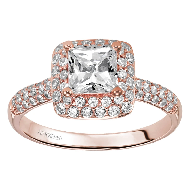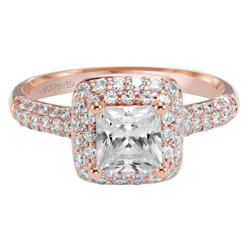 SKU: Y2ZYA 82313614789431 Categories: Engagement Rings, Halo Tags: Category_l1: Engagement Rings>Halo, Category_l2: Halo, Category_tree: Engagement Rings>Halo, Center_stone_shape: Princess, Collection: Pave, Designer: ArtCarved Bridal, Diamond_setting: Prong, Gemstone_color: White, Gender: Women, Metal_color: Rose, Metal_type: 14k Gold, Number_of_diamonds: 69, Type_of_gemstone: Cubic Zirconia