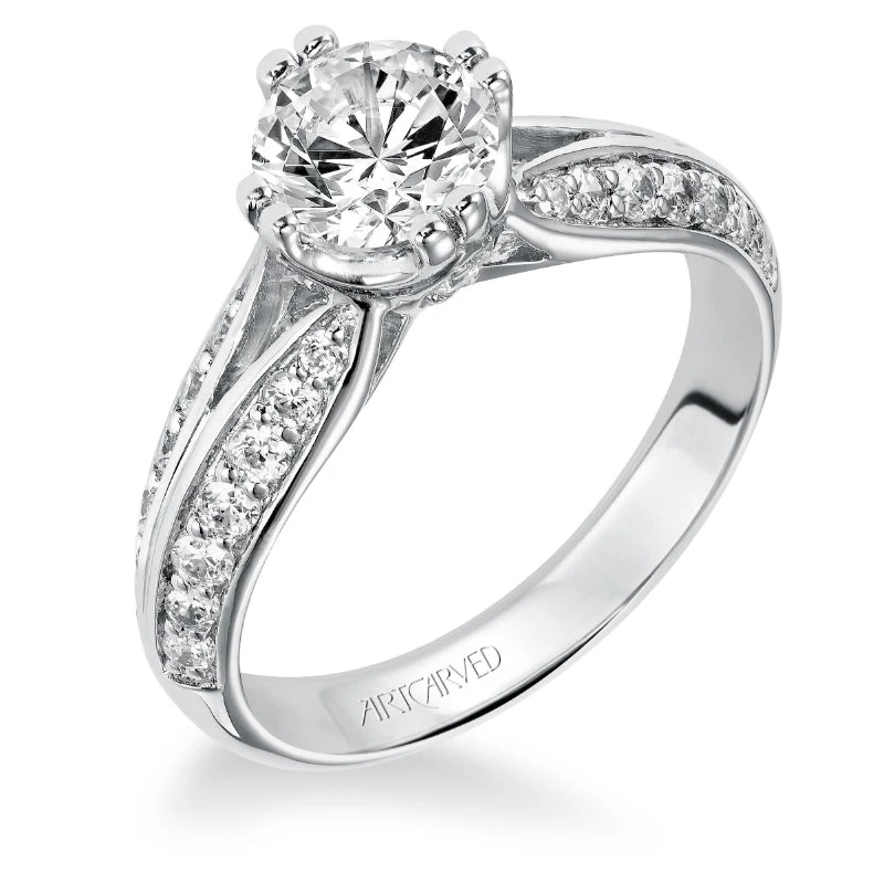 SKU: Y2ZYA 82313484372791 Categories: Engagement Rings, Split Shank Tags: Category_l1: Engagement Rings>Split Shank, Category_l2: Split Shank, Category_tree: Engagement Rings>Split Shank, Center_stone_shape: Round, Designer: ArtCarved Bridal, Diamond_setting: Prong, Gemstone_color: White, Gender: Women, Metal_color: White, Metal_type: 14k Gold, Number_of_diamonds: 35, Type_of_gemstone: Cubic Zirconia