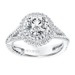 SKU: Y2ZYA 82314832775991 Category: Engagement Rings Tags: Category_l1: Engagement Rings>Halo, Category_l2: Halo, Category_tree: Engagement Rings>Halo, Center_stone_shape: Round, Collection: Rope, Designer: ArtCarved Bridal, Diamond_setting: Prong, Gemstone_color: White, Gender: Women, Metal_color: White, Metal_type: 14k Gold, Number_of_diamonds: 55, Type_of_gemstone: Cubic Zirconia