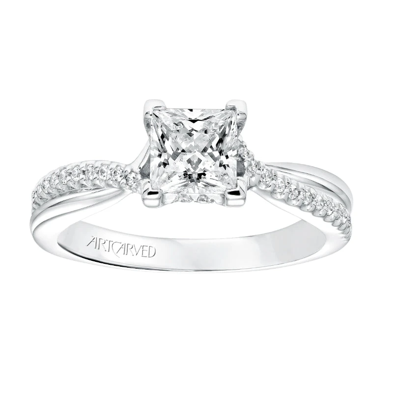 SKU: Y2ZYA 82314606676791 Categories: Engagement Rings, Twisted Tags: Category_l1: Engagement Rings>Twisted, Category_l2: Twisted, Category_tree: Engagement Rings>Twisted, Center_stone_shape: Princess, Collection: Twist, Designer: ArtCarved Bridal, Diamond_setting: Prong, Gemstone_color: White, Gender: Women, Metal_color: White, Metal_type: 14k Gold, Number_of_diamonds: 33, Type_of_gemstone: Cubic Zirconia