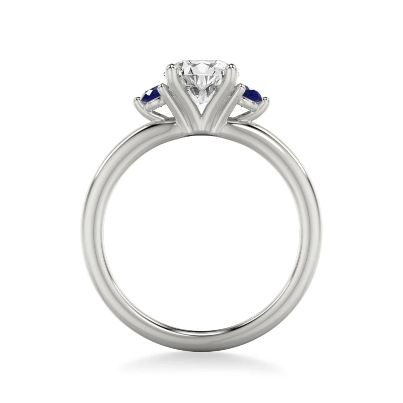 Classic Three Stone Diamond Engagement Ring With Round Blue Sapphire Side Stones