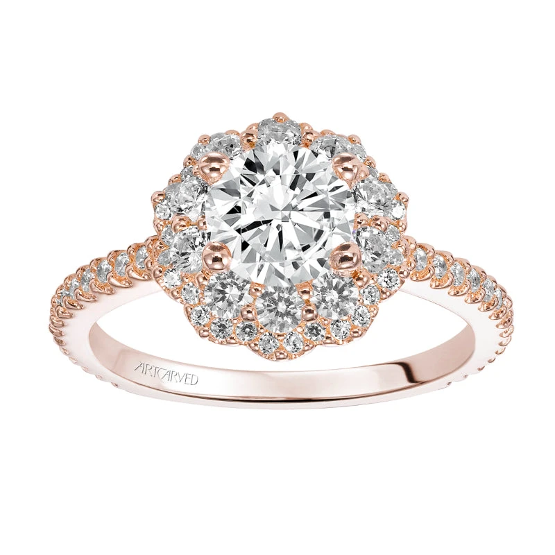 ArtCarved Bridal Artcarved Bridal Semi-Mounted With Side Stones Contemporary Floral Halo Engagement Ring Priscilla 14K Rose Gold