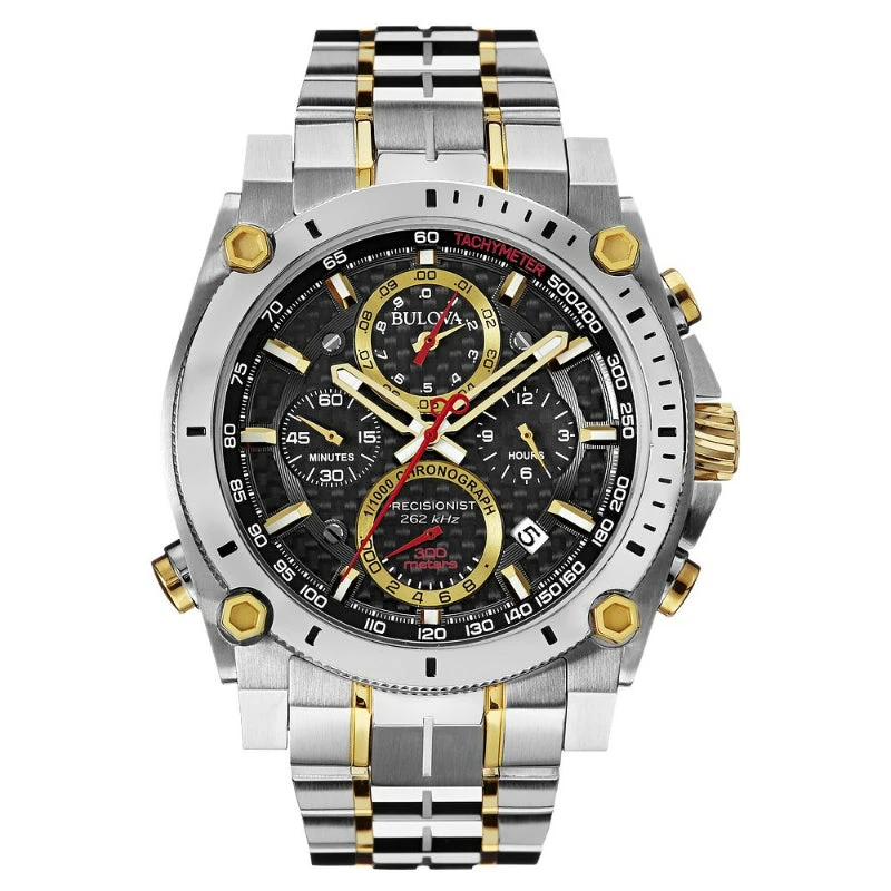 From the Icon Collection with precise timing to 1/1000th of a second and continuous-sweep second hand, the chronograph is particularly refined. In stainless steel with gold and silver ion-plated finish, black multi-level carbon fiber dial, luminous hour and minute hands, luminous markers, calendar, screw-back case, screw-down crown, and double-press fold-over clasp with safety lock. Powered by Bulovas proprietary three-prong quartz crystal Precisionist movement with a 262kHz vibrational frequency–eight times greater than standard quartz watches–for unparalleled accuracy.