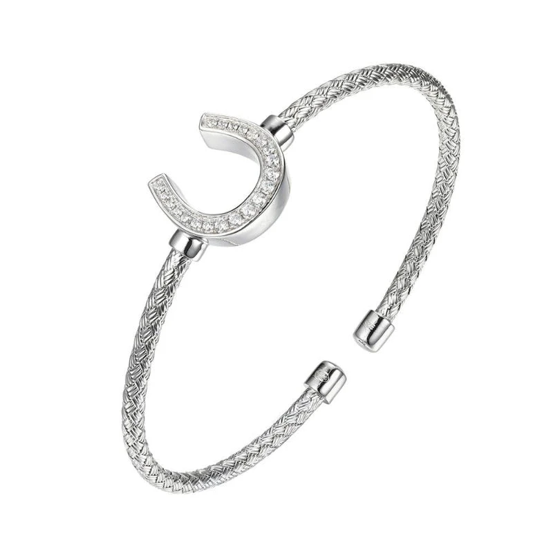 Charles Garnier Charles Garnier Sterling Silver 3mm Mesh Cuff With CZ Horseshoe (16x14mm) In Center Rhodium Finish
