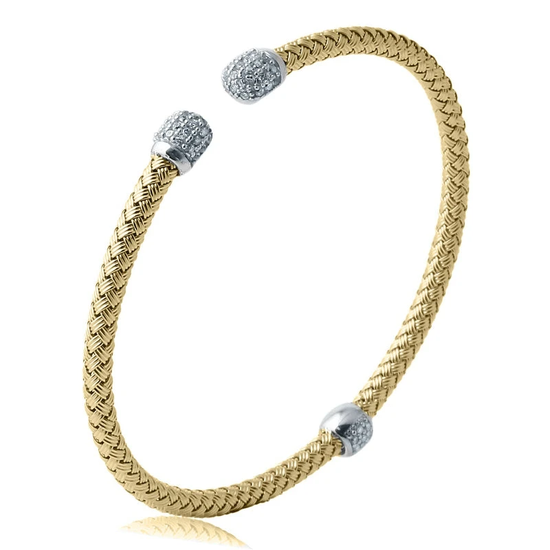 Sterling Silver 4mm Mesh Cuff with CZ, Reversible, 2 Tone, 18K Yellow Gold and Rhodium Finish