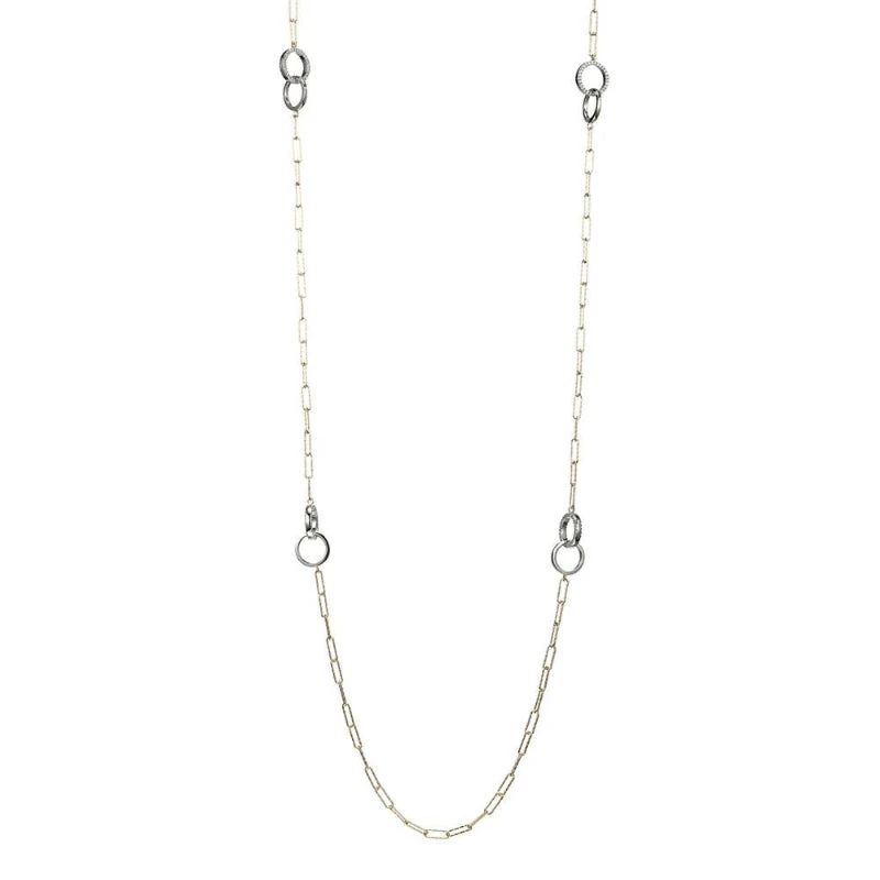 Sterling Silver Necklace made with Diamond Cut Paperclip Chain (3mm) and 4 Double Circle (one CZ Circle, one Plain Circle) Stations, Measures 36” Long, 2 Tone, 18K Yellow Gold and Rhodium Finish
