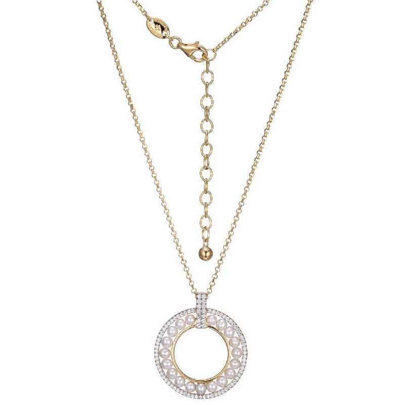 Sterling Silver Necklace made with Freshwater Pearls (2.5-3mm) and CZ Circle Pendant, Measures 17” Long, Plus 2” Extender for Adjustable Length, 2 Tone, 18K Yellow Gold and Rhodium Finish