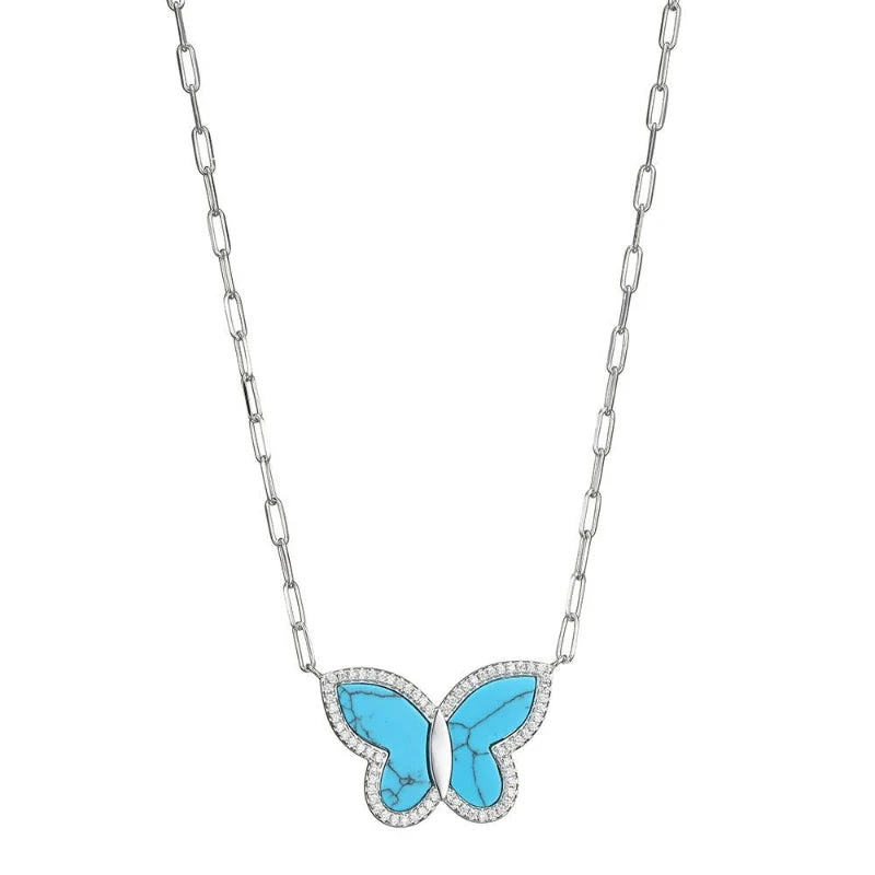 Sterling Silver Necklace made with Paperclip Chain (2mm) and Butterfly (25x17mm) in Center, Stones are Synthetic Turquoise and CZ, Measures 17” Long, Plus 2” Extender for Adjustable Length, Rhodium Finish