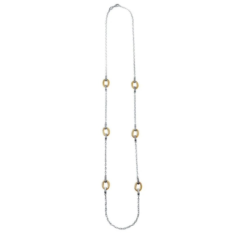 Sterling Silver Necklace with Mesh and CZ, 36” Long, 2 Tone 18K Yellow Gold and Rhodium Finish
