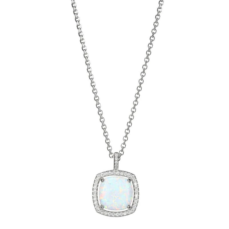 Sterling Silver Necklace with Synthetic Opal and CZ, 17”+2”, Rhodium Finish