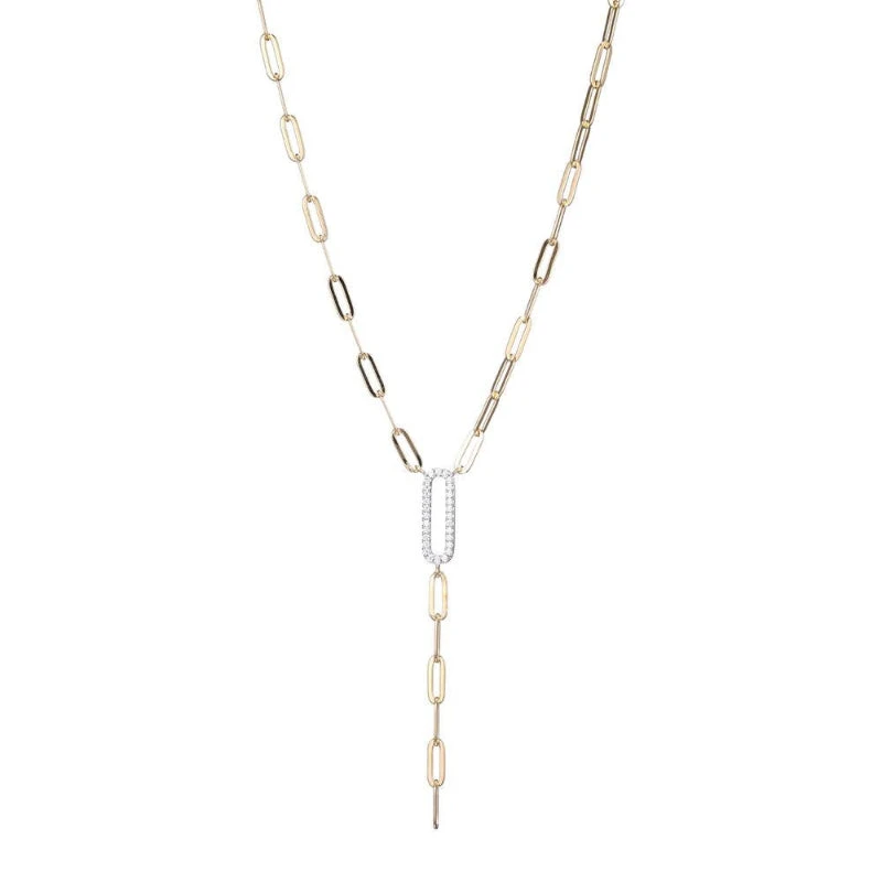 Sterling Silver ”Y” Necklace made with Paperclip Chain (3mm) and a CZ Link (18x6mm) in Center, Measures 17” Long, Plus 2” Extender for Adjustable Length, 2 Tone, 18K Yellow Gold and Rhodium Finish
