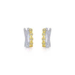 14k Yellow & White Gold Criss Cross 10mm Diamond Huggie Earrings