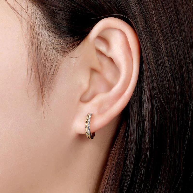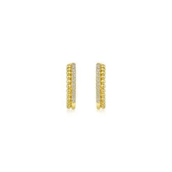 14k Yellow Gold Beaded Pave Diamond Huggie Earrings
