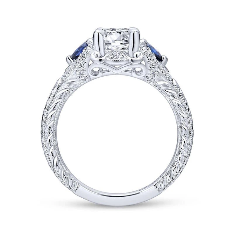 14k White Gold 3 Stone Diamond and Round Blue Sapphire Gemstone Engagement Ring. SETTING ONLY; center stone not included