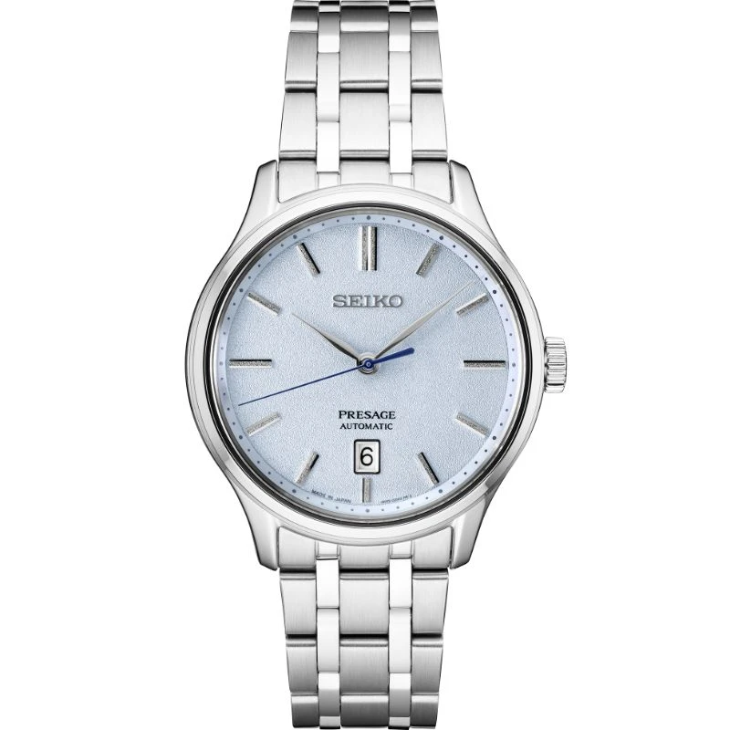 From the Presage Japanese Garden Collection.. Offering the finest in Japanese mechanical watchmaking, the Presage Collection blends precision technology with superior craftsmanship and design. From a group inspired by the serenity of a traditional Japanese garden, this elegant US exclusive timepiece features a patterned light blue dial with textured indices evoking stepping stone paths, as well as a dual-curved sapphire crystal, blue second hand, and date calendar. The screwdown see-through caseback provides a view of the 23-jewel movement with manual and automatic winding capability, a frequency of 21,600 vibrations per hour and a power reserve of approximately 41 hours. Crafted of stainless steel, with deployment clasp and push button release. 3 bar, 30M Water Resistant