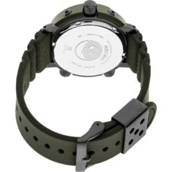 The digital display offers time, date, alarm and chronograph readouts with a stopwatch function, power reserve indicator and dual time capability, while the black analogue dial features LumiBrite hands and markers. The energy-efficient solar cell, powered by any light source, with no battery change required, provides a 6-month power reserve when fully charged. With a black one-way rotating elapsed timing bezel, this versatile watch includes a lightweight khaki green case, secure screwdown crown, pushers and caseback, and durable khaki green silicone strap, and follows ISO standards for scuba diving. 200m Water Resistant